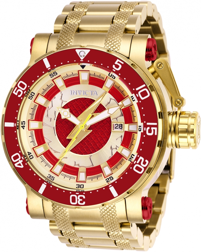 Gold-tone stainless steel case with a gold-tone stainless steel bracelet. Uni-directional rotating gold-tone stainless steel bezel. Red dial with gold-tone hands and index hour markers. Minute scale around the inner rim. Dial Type: Analog. Luminescent hands and markers. Date display at the 3 o'clock position. SII Caliber NH35A automatic movement with a 41-hour power reserve. Scratch resistant flame fusion crystal. Screw down crown. Solid case back. Round case shape. Case size: 52 mm. Band width: 26 mm, band length: 8 inches. Deployment clasp. Water resistant at 200 meters / 660 feet. Functions: date, hour, minute, second. Casual watch style. Watch label: Japan Movt. Invicta DC Comics Flash Automatic Red Dial Mens Watch 26827.