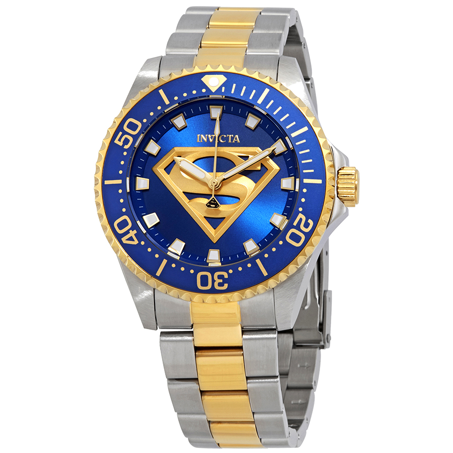 Silver-tone stainless steel case with a two-tone (silver-tone and gold-tone) stainless steel bracelet. Uni-directional rotating blue stainless steel bezel. Blue dial with gold-tone hands and index hour markers. Minute markers around the outer rim. Dial Type: Analog. Luminescent hands and markers. TMI Caliber PC21J quartz movement. Scratch resistant mineral crystal. Pull / push crown. Solid case back. Round case shape, case size: 44 mm, case thickness: 14 mm. Band width: 22 mm, band length: 8.5 inches. Fold over clasp. Water resistant at 100 meters / 330 feet. Functions: hour, minute, second. Casual watch style. Watch label: Japan Movt. Invicta DC Comics Superman Quartz Blue Dial Mens Watch 29690.