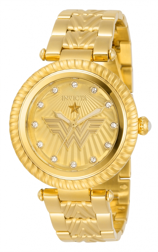 Gold-tone stainless steel case and bracelet. Fixed gold-tone stainless steel bezel. Gold-tone dial with gold-tone hands and crystal hour markers. Dial Type: Analog. Luminescent hands. TMI Caliber PC21J quartz movement. Scratch resistant Flame Fusion crystal. Pull / push crown. Solid case back. Round case shape, case size: 40 mm, case thickness: 11.2 mm. Band width: 20 mm, band length: 7 inches. Fold over clasp. Water resistant at 100 meters / 330 feet. Functions: hour, minute, second. Dc Comics Series. Casual watch style. Watch label: Japan Movt. Invicta DC Comics Wonder Woman Quartz Crystal Gold Dial Ladies Watch 33171.