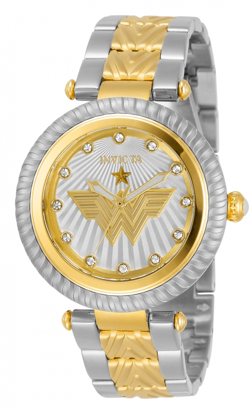 Silver-tone stainless steel case with a two-tone (silver-tone and gold-tone) stainless steel bracelet. Fixed gold-tone stainless steel bezel. Two-tone (silver-tone and gold-tone) dial with gold-tone hands and crystal hour markers. Dial Type: Analog. Luminescent hands. TMI Caliber PC21J quartz movement. Scratch resistant Flame Fusion crystal. Pull / push crown. Solid case back. Round case shape, case size: 40 mm, case thickness: 11.2 mm. Band width: 20 mm, band length: 7 inches. Fold over clasp. Water resistant at 100 meters / 330 feet. Functions: hour, minute, second. Dc Comics Series. Casual watch style. Watch label: Japan Movt. Invicta DC Comics Wonder Woman Quartz Ladies Watch 33172.