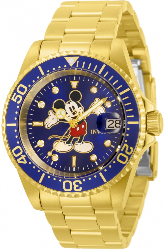Gold-tone stainless steel case with a gold-tone stainless steel bracelet. Uni-directional rotating blue stainless steel bezel. Blue dial with gold-tone Mercedes-logo shape hands and index hour markers. Minute markers around the outer rim. Dial Type: Analog. Luminescent hands and markers. Date display at the 3 o'clock position. SII Caliber NH35A Automatic movement, containing 24 Jewels, bitting at 21600 vph, and has a power reserve of approximately 41 hours. Scratch resistant mineral crystal. Screw down crown. Transparent case back. Round case shape, case size: 40 mm, case thickness: 13.3 mm. Band width: 20 mm, band length: 8.25 inches. Fold over clasp. Water resistant at 200 meters / 660 feet. Functions: date, hour, minute, second. Casual watch style. Watch label: Japan Movt. Invicta Disney Limited Edition Automatic Blue Dial Mens Watch 32506.