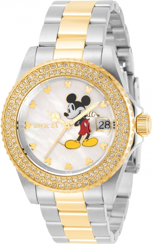Two-tone (silver-tone and gold-tone) stainless steel case with a two-tone (silver-tone and gold-tone) stainless steel bracelet. Fixed gold-tone crystal set bezel. White dial with gold-tone Mercedes-logo shape hands and index hour markers. Dial Type: Analog. Luminescent hands. Date display at the 3 o'clock position. Ronda Caliber 515 quartz movement. Scratch resistant mineral crystal. Screw down crown. Solid case back. Round case shape, case size: 40 mm, case thickness: 12.2 mm. Band width: 20 mm, band length: 8 inches. Fold over clasp. Water resistant at 200 meters / 660 feet. Functions: date, hour, minute, second. Casual watch style. Watch label: Swiss Movt. Invicta Disney Limited Edition Mickey Mouse Quartz Crystal White Dial Ladies Watch 32483.