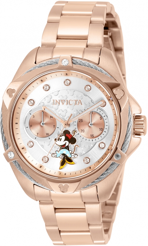 Rose gold-tone stainless steel case and bracelet. Fixed silver and rose gold stainless steel and cable bezel. Silver-tone dial with rose gold-tone hands and crystal hour markers. Minute markers around the outer rim. Dial Type: Analog. Luminescent hands. Date display at the 3 o'clock position. Two sub-dials displaying: date and day. TMI Caliber VH64 quartz movement. Scratch resistant Flame Fusion crystal. Pull / push crown. Solid case back. Round case shape, case size: 38 mm, case thickness: 12.2 mm. Band width: 18 mm, band length: 7 inches. Fold over clasp. Water resistant at 100 meters / 330 feet. Functions: date, day, hour, minute, second. Disney Limited Edition Series. Dress watch style. Watch label: Japan Movt. Invicta Disney Limited Edition Minnie Mouse Quartz Crystal Ladies Watch 32439.