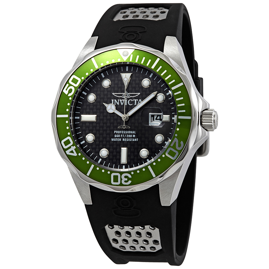 Stainless steel case with a black polyurethane strap with silver-tone accents. Uni-directional rotating green ion-plated bezel. Black dial with silver-tone hands and index hour markers. Minute markers around the outer rim. Dial Type: Analog. Luminescent hands and markers. Date display at the 3 o'clock position. Quartz movement. Scratch resistant flame fusion crystal. Pull / push crown. Solid case back. Case diameter: 47 mm. Case thickness: 13 mm. Round case shape. Band width: 30 mm. Band length: 10 inches. Tang clasp. Water resistant at 200 meters / 660 feet. Functions: date, hour, minute, second. Sport watch style. Invicta Grand Diver Mens Watch 12560.