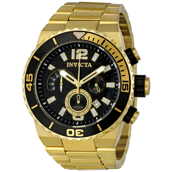 Gold-tone stainless steel case and bracelet. Uni-directional rotating black with gold-tone stainless steel bezel. Black dial with luminous gold-tone hands and index hour markers. Arabic numerals mark the 6 and 12 o'clock positions. Minute markers around the oter rim. Dial Type: Analog. Luminescent hands and markers. Date display between 4 and 5 o'clock position. Chronograph - three sub-dials displaying: 60 second, 60 minute and 24 hour. TMI Caliber VD53B-14 quartz movement. Scratch resistant Flame Fusion crystal. Pull / push crown. Solid case back. Round case shape, case size: 47 mm, case thickness: 16 mm. Band width: 24 mm, band length: 9.25 inches. Fold over clasp. Water resistant at 100 meters / 330 feet. Functions: hours, minutes, seconds, chronograph, date. Pro Diver Series. Sport watch style. Watch label: Japan Movt. Invicta Divers Quest Chronograph Gold-tone Black Dial Mens Watch 1343.