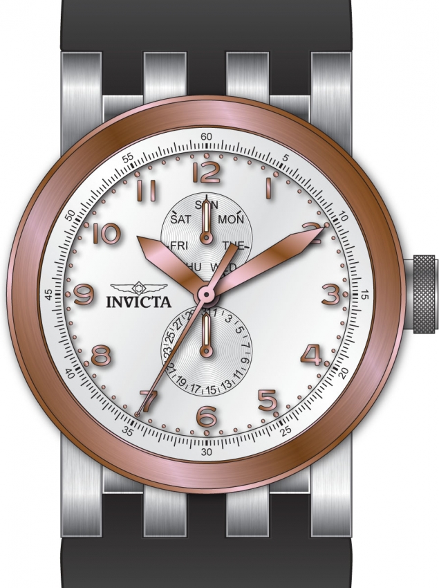 Two-tone (silver-tone and rose gold-tone) stainless steel case with a black silicone strap. Fixed rose gold-tone stainless steel bezel. Antique silver dial with rose gold-tone sword-shaped hands and Arabic numeral hour markers. Minute markers around the outer rim. Dial Type: Analog. 60 second, 24 hour subdials. Hattori Caliber VD77 quartz movement. Scratch resistant mineral crystal. Pull / push crown. Solid case back. Round case shape, case size: 46 mm, case thickness: 14.3 mm. Band width: 33.5 mm, band length: 8.75 inches. Buckle clasp. Water resistant at 100 meters / 330 feet. Functions: GMT, second time zone, hour, minute, small second. Dna Series. Sport watch style. Watch label: Japan Movt. Invicta DNA Quartz Antique Silver Dial Mens Watch 31784.
