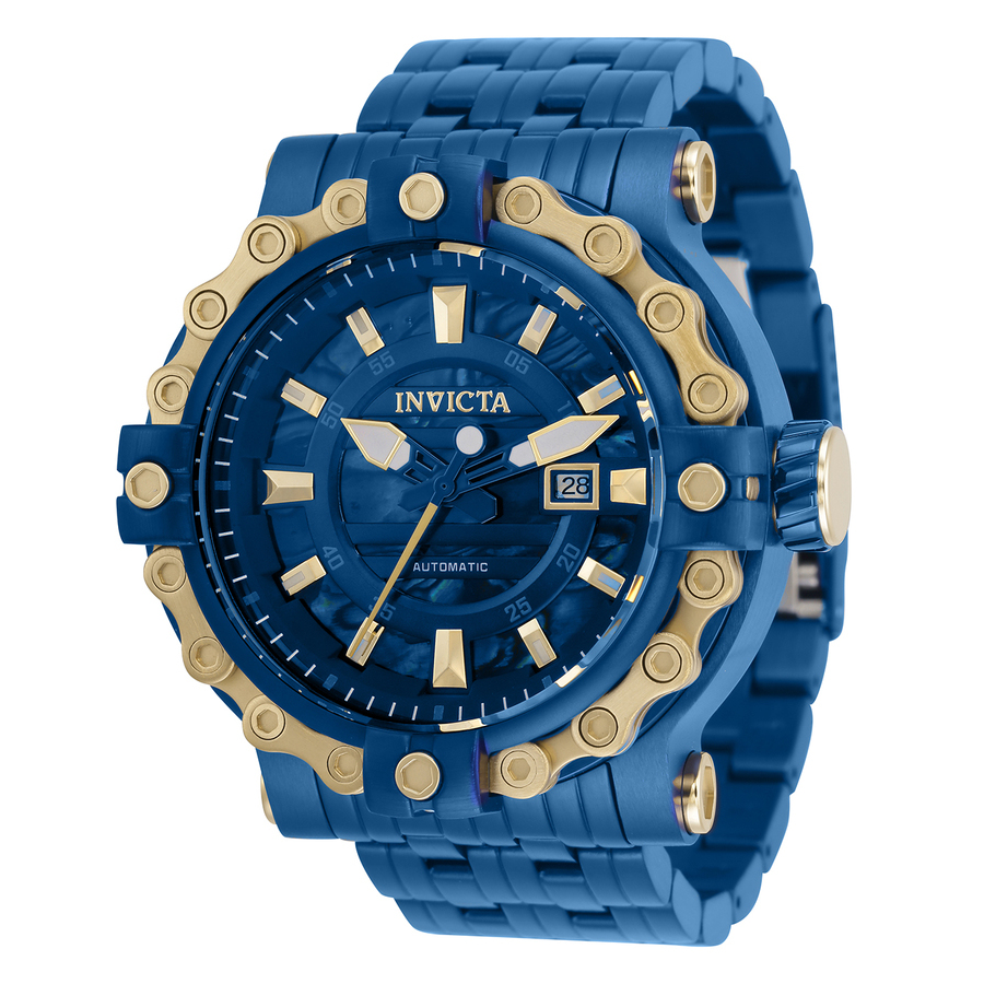 As a new horizon comes to the fore intriguing horizons beckon. The Invicta Excursion transforms expectation setting a wholly new precedent. Appointed with Swiss made excellence the Excursion proves to be an enlightened guide for any exploration. Map your course. Blue stainless steel case and bracelet. Gold and blue stainless steel bezel. Blue dial with gold-tone hands and index hour markers. Minute markers around the outer rim. Dial Type: Analog. Luminescent hands and markers. Date display at the 3 o'clock position. TMI Caliber NH35 Automatic movement, containing 24 Jewels, bitting at 21600 vph, and has a power reserve of approximately 41 hours. Scratch resistant Flame Fusion crystal. Pull / push crown. Round case shape, case size: 53.5 mm, case thickness: 20.20 mm. Band width: 26 mm, band length: 8.75 inches. Fold over clasp. Water resistant at 100 meters / 330 feet. Functions: date, hour, minute, second. Excursion Series. Casual watch style. Watch label: Japan Movt. Invicta Excursion Blue Dial Mens Watch 35180.
