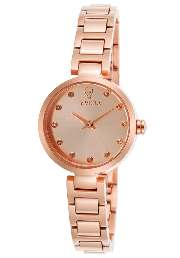 Rose gold-tone stainless steel case with a rose gold-tone stainless steel bracelet. Fixed rose gold-tone stainless steel bezel. Rose gold-tone dial with rose gold-tone hands and diamond hour markers. Dial Type: Analog. Hattori Caliber PC10 quartz movement. Scratch resistant mineral crystal. Pull / push crown. Solid case back. Round case shape, case size: 26 mm, case thickness: 8 mm. Band width: 10 mm, band length: 7 inches. Butterfly clasp. Water resistant at 50 meters / 165 feet. Functions: hour, minute. Additional Info: 11 white diamonds. Dress watch style. Watch label: Japan Movt. Invicta Gabrielle Union Diamond Rose Gold Dial Ladies Watch 22950.
