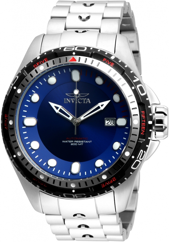 Stainless steel case with a stainless steel bracelet. Uni-directional rotating grey aluminum bezel with a stainless steel ring. Blue dial with silver-tone sword-shaped skeleton hands and dot hour markers. Minute markers around the outer rim. Dial Type: Analog. Luminescent hands and markers. Date display at the 3 o'clock position. SII caliber NH35A automatic movement, containing 24 Jewels, bitting at 21600 vph, and has a power reserve of approximately 41 hours. Scratch resistant mineral crystal. Screw down crown. Transparent case back. Round case shape. Case size: 51 mm. Case thickness: 17 mm. Band width: 24 mm. Band length: 8.25 inches. Fold over clasp. Water resistant at 200 meters / 660 feet. Functions: date, hour, minute, second. Hydromax Series. Casual watch style. Watch label: Japan Movt. Invicta Hydromax Automatic Blue Dial Mens Watch 32236.