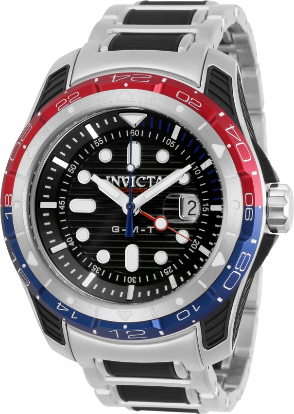 Stainless steel case with a stainless steel with black silicone accents strap. Uni-directional rotating stainless steel bezel with a blue and red (Pepsi) ring. Black dial with luminous silver-tone hands and dot hour markers. Minute markers around the outer rim. Dial Type: Analog. Luminescent hands and markers. Date display at the 3 o'clock position. Ronda caliber 515.24H quartz movement. Scratch resistant Flame Fusion crystal. Screw down crown. Solid case back. Round case shape. Case size: 48 mm. Case thickness: 16 mm. Band width: 24 mm. Band length: 8.25 inches. Butterfly clasp. Water resistant at 200 meters / 660 feet. Functions: date, GMT, second time zone, hour, minute, second. Hydromax Series. Casual watch style. Watch label: Swiss Movt. Invicta Hydromax Quartz Black Dial Pepsi Bezel Mens Watch 29581.