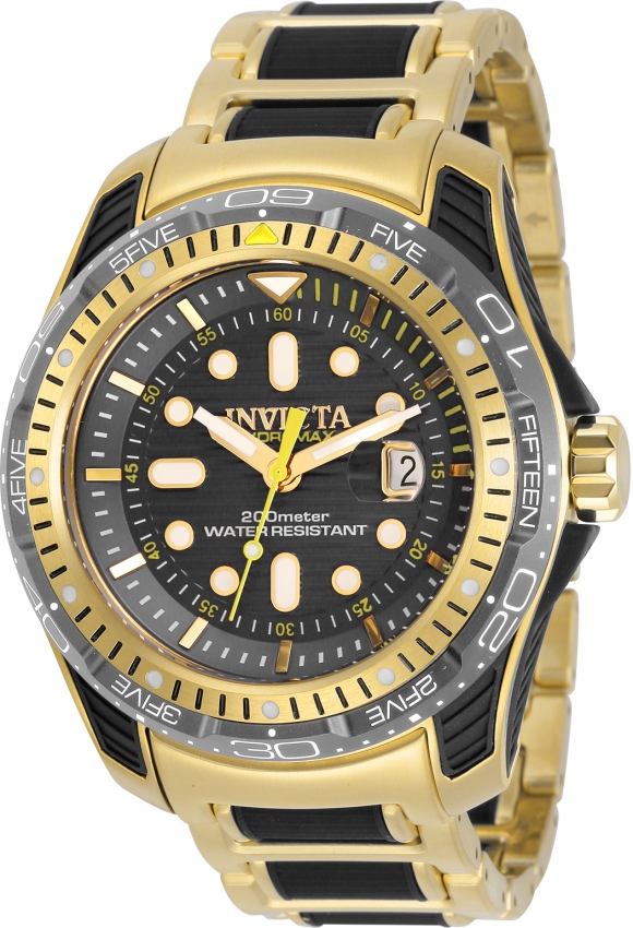 Gold-tone stainless steel case with a two-tone (black and gold-tone) stainless steel and silicone strap. Uni-directional rotating grey stainless steel bezel. Grey dial with gold-tone hands and index hour markers. Minute markers around the outer rim. Dial Type: Analog. Luminescent hands and markers. Date display at the 3 o'clock position. Ronda Caliber 515 quartz movement. Scratch resistant flame fusion crystal. Screw down crown. Solid case back. Round case shape, case size: 48 mm, case thickness: 16 mm. Band width: 24 mm, band length: 8.25 inches. Butterfly clasp. Water resistant at 200 meters / 660 feet. Functions: date, hour, minute, second. Casual watch style. Watch label: Swiss Movt. Invicta Hydromax Quartz Grey Dial Mens Watch 29590.