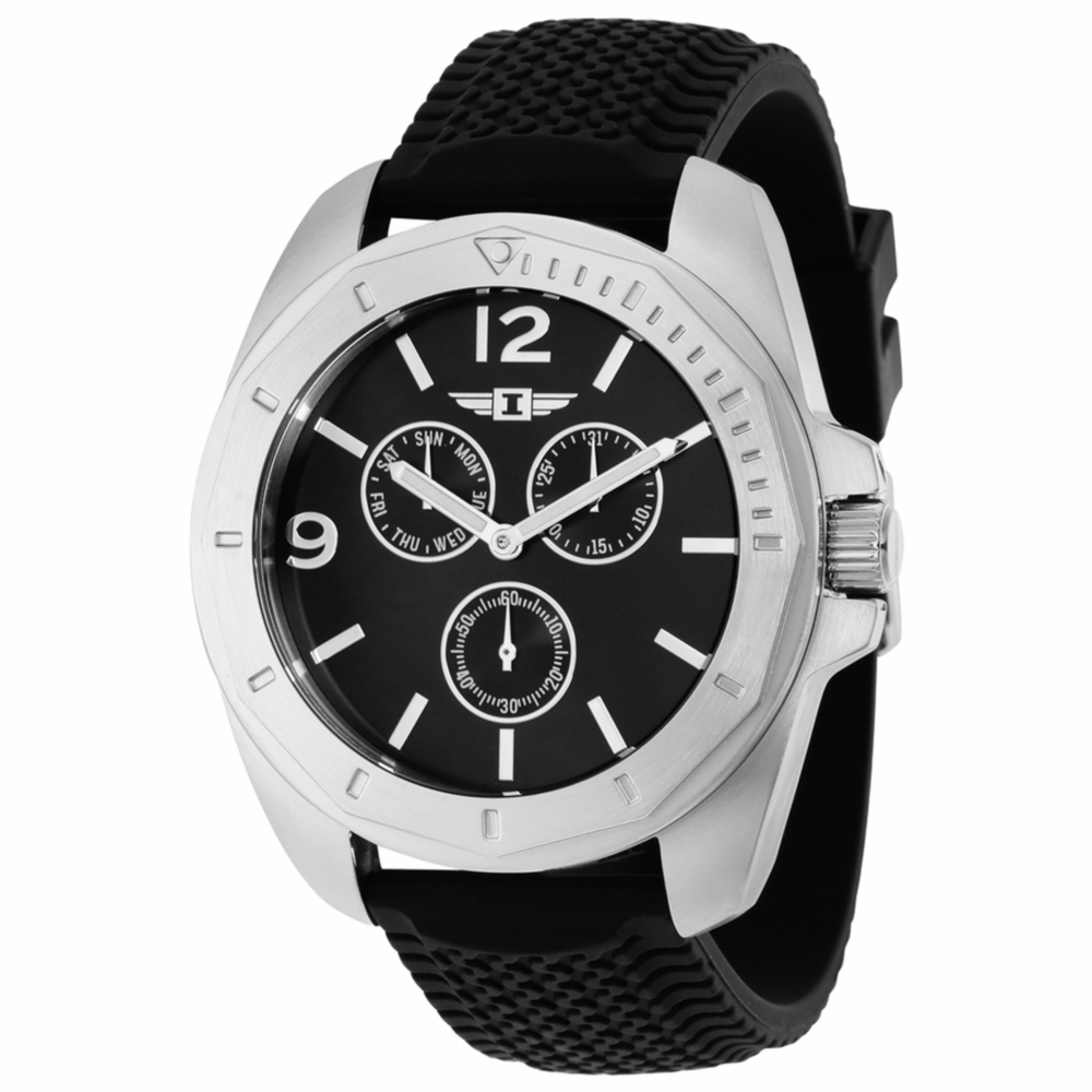 Silver-tone stainless steel case with a black silicone strap. Silver-tone stainless steel bezel. Black dial with silver-tone hands and Arabic numeral, index hour markers. Minute markers around the outer rim. Dial Type: Analog. Caliber VD76 quartz movement. Scratch resistant mineral crystal. Pull / push crown. Case size: 45 mm. Water resistant at 50 meters / 165 feet. Functions: date, day, hour, minute, second. I by invicta series. Invicta I By Invicta Quartz Black Dial Mens Watch IBI36499.