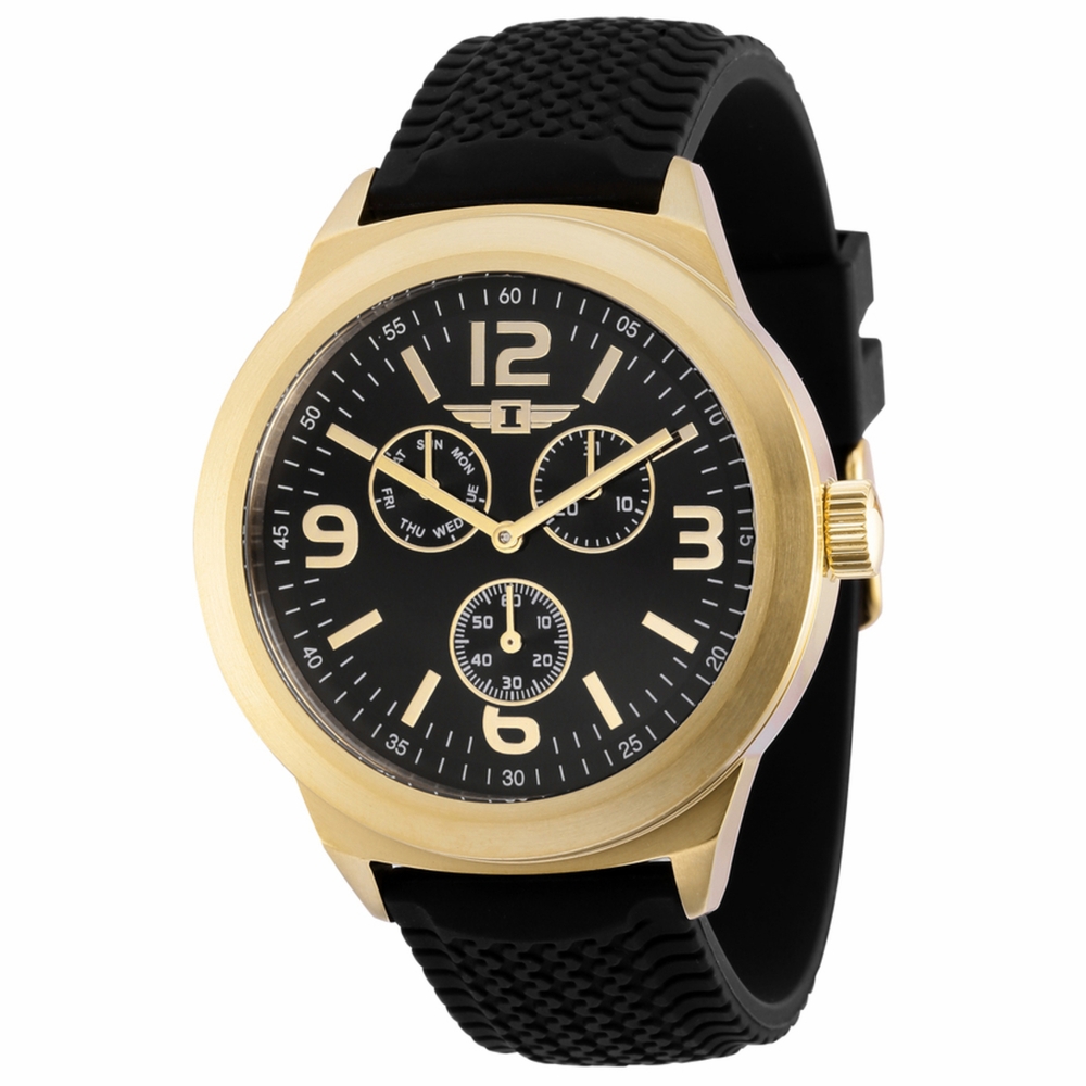 Gold-tone stainless steel case with a black silicone strap. Gold-tone stainless steel bezel. Black dial with gold-tone hands and Arabic numeral, index hour markers. Dial Type: Analog. Quartz movement. Scratch resistant mineral crystal. Pull / push crown. Round case shape, case size: 46 mm. Buckle clasp. Water resistant at 50 meters / 165 feet. Functions: date, day, hour, minute, second. I by invicta series. Invicta I By Invicta Quartz Black Dial Mens Watch IBI36529.