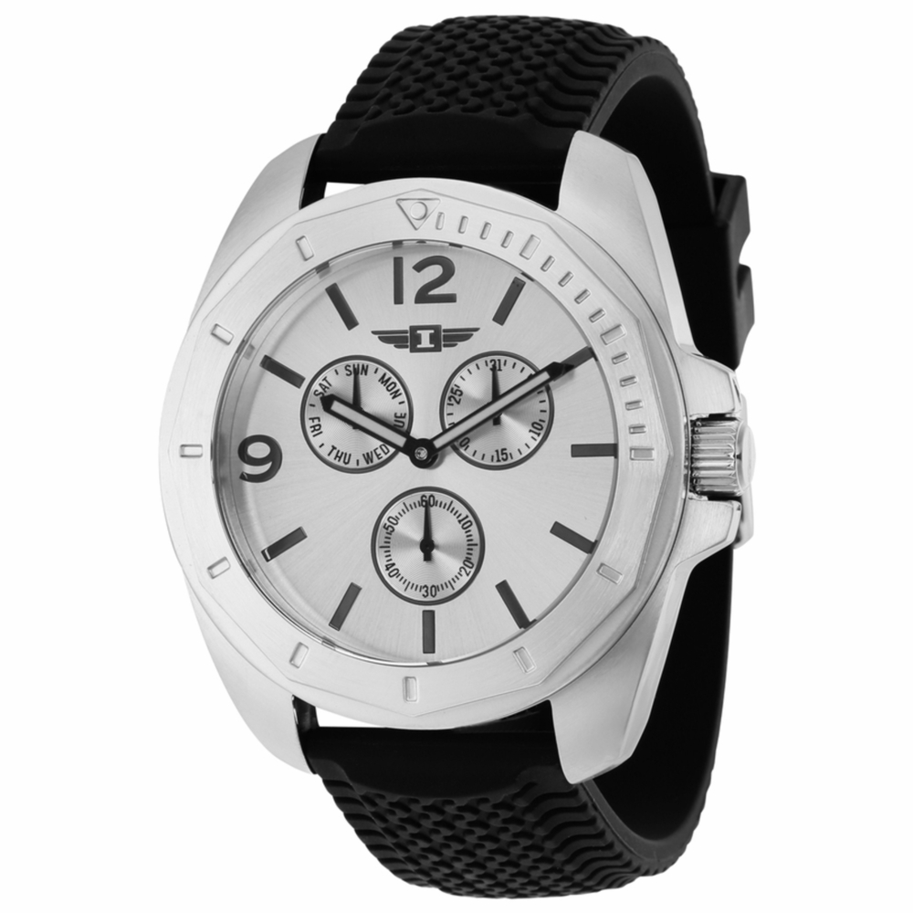 Stainless steel case with a black silicone strap. Uni-directional rotating stainless steel bezel. Silver dial with luminous black hands and index hour markers. Minute markers around the outer rim. Dial Type: Analog. Luminescent hands. Three multi-function sub-dials displaying: day of the week , date and 60 seconds. Caliber VD76 quartz movement. Scratch resistant mineral crystal. Pull / push crown. Round case shape. Case size: 45 mm. Band width: 22 mm. Tang clasp. Water resistant at 50 meters / 165 feet. Functions: date, day, hour, minute, second. I By Invicta Series. Invicta I By Invicta Quartz Silver-tone Dial Mens Watch IBI36498.