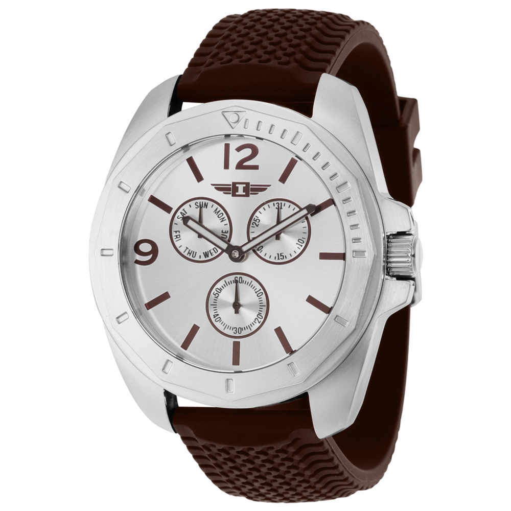 Stainless steel case with a brown silicone strap. Fixed stainless steel bezel. Silver dial with luminous brown hands and index hour markers. Arabic numerals appear at the 9 and 12 o'clock positions. Dial Type: Analog. Luminescent hands. Three multi-function sub-dials displaying: 60 seconds, date and day of the week. Caliber VD76 quartz movement. Scratch resistant mineral crystal. Pull / push crown. Solid case back. Round case shape. Case size: 45 mm. Band width: 22 mm. Tang clasp. Water resistant at 50 meters / 165 feet. Functions: date, day, hour, minute, second. I By Invicta Series. Casual watch style. Watch label: Japan Movt. Invicta I By Invicta Quartz Silver Dial Mens Watch IBI36500.