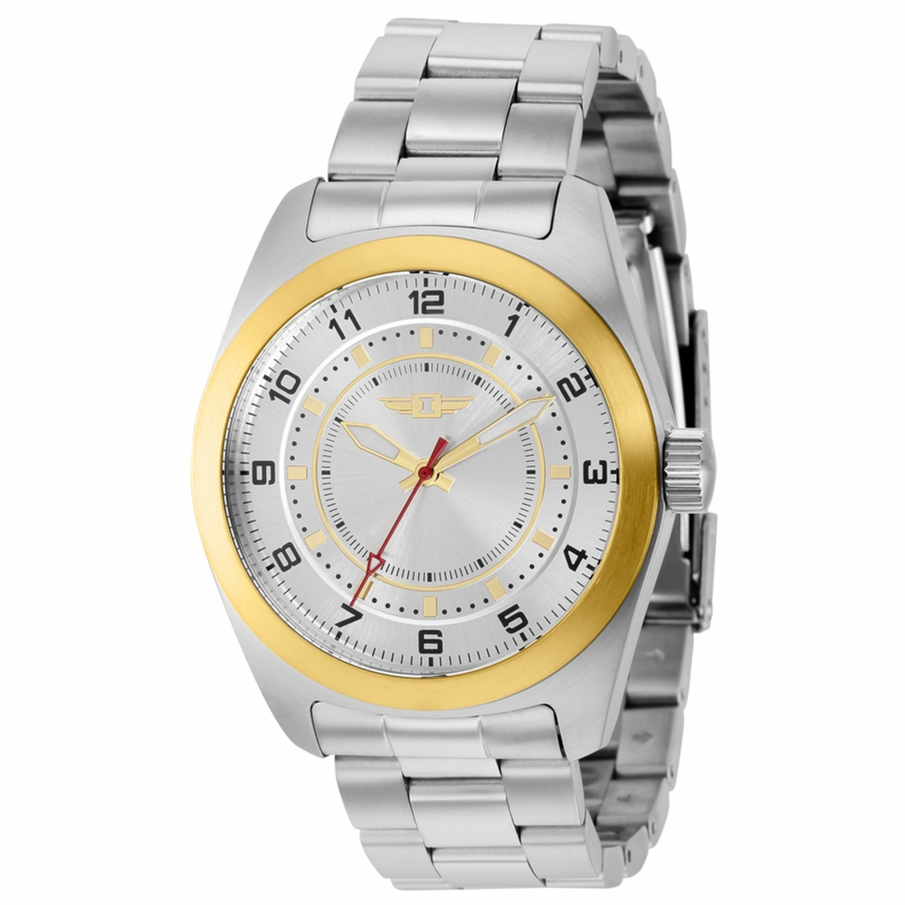 Stainless steel case with a stainless steel bracelet. Fixed gold-tone bezel. Silver dial with luminous gold-tone hands and Arabic numeral hour markers. Minute markers around the outer rim. Dial Type: Analog. Luminescent hands and markers. Caliber PC21 quartz movement. Scratch resistant mineral crystal. Pull / push crown. Solid case back. Round case shape. Case size: 43 mm. Band width: 22 mm. Fold over clasp. Water resistant at 50 meters / 165 feet. Functions: hour, minute, second. I By Invicta Series. Casual watch style. Invicta I By Invicta Quartz Silver-tone Dial Mens Watch IBI36511.