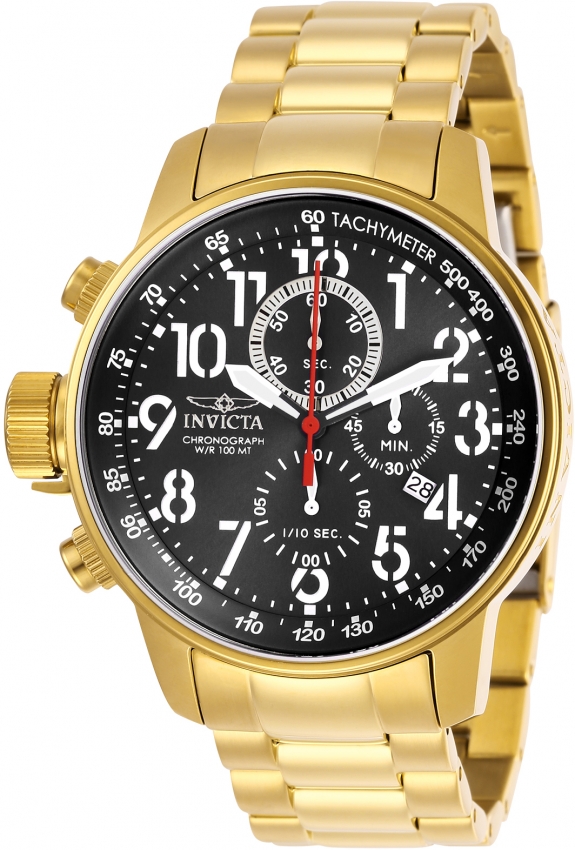 Gold-tone stainless steel case with a gold-tone stainless steel bracelet. Fixed gold-tone stainless steel bezel. Black dial with silver-tone hands and Arabic numeral hour markers. Tachymeter scale around the outer rim. Dial Type: Analog. Luminescent hands and markers. Date display at the 4 o'clock position. Chronograph - sub-dials displaying: three - 60 second, 60 minute and 1/10th of a second. Hattori Caliber VD57 quartz movement. Scratch resistant mineral crystal. Pull / push crown. Solid case back. Round case shape, case size: 46 mm, case thickness: 12.6 mm. Band width: 22 mm, band length: 7.50 inches. Fold over clasp. Water resistant at 100 meters / 330 feet. Functions: chronograph, date, hour, minute, second. Sport watch style. Watch label: Japan Movt. Invicta I-Force Chronograph Quartz Black Dial Mens Watch 28745.