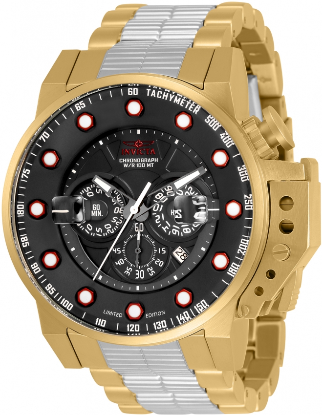 Gold-tone stainless steel case with a two-tone (silver-tone and gold-tone) stainless steel bracelet. Fixed gold-tone stainless steel bezel. Black dial with gunmetal hands and index hour markers. Tachymeter scale around the outer rim. Dial Type: Analog. Luminescent hands and markers. Date display between 4 and 5 o'clock position. Chronograph - three sub-dials displaying: 60 second, 60 minute and 24 hour. Hattori Caliber VD53 quartz movement. Scratch resistant mineral crystal. Pull / push crown. Solid case back. Round case shape, case size: 50 mm, case thickness: 18.1 mm. Band width: 26 mm, band length: 8.25 inches. Fold over clasp. Water resistant at 100 meters / 330 feet. Functions: chronograph, date, GMT, second time zone, hour, minute, second. I-force Series. Military watch style. Watch label: Japan Movt. Invicta I-Force Chronograph Quartz Black Dial Mens Watch 33411.