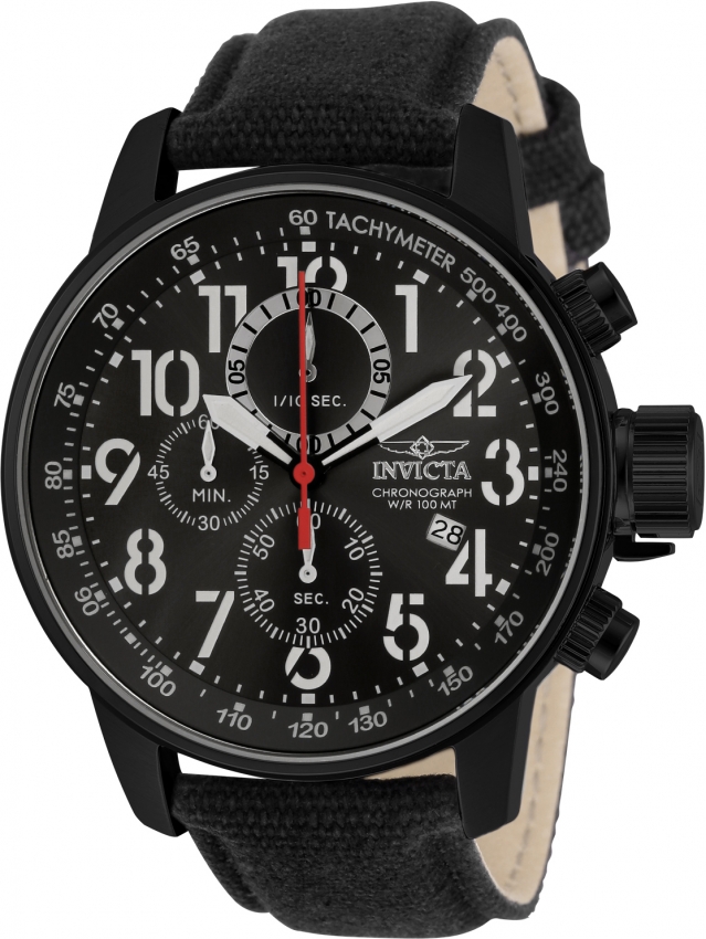 Black ion-plated stainless steel case with a black (rifle) leather strap. Fixed black ion-plated bezel. Black dial with luminous silver-tone sword-shaped hands and Arabic numeral hour markers. Minute markers. Tachyemter markings around the outer rim. Dial Type: Analog. Luminescent hands and markers. Date display at the 4 o'clock position. Chronograph - three sub-dials displaying: 60 second, 60 minute and 1/10th of a second. Hattori caliber VD57 quartz movement. Scratch resistant mineral crystal. Pull / push crown. Solid case back. Round case shape. Case size: 46 mm. Case thickness: 12.6 mm. Band width: 22 mm. Band length: 8.25 inches. Tang clasp. Water resistant at 100 meters / 330 feet. Functions: chronograph, tachymeter, date, hour, minute, second. Sport watch style. Watch label: Japan Movt. Invicta I-Force Chronograph Quartz Black Dial Mens Watch 30921.