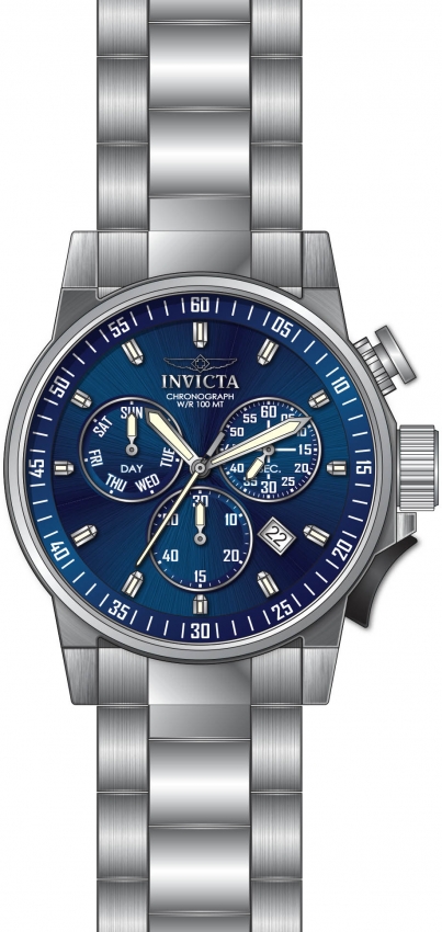 Stainless steel case with a stainless steel bracelet. Fixed stainless steel bezel. Blue dial with luminous silver-tone hands and index hour markers. Minute markers around the outer rim. Dial Type: Analog. Luminescent hands and markers. Date display between the 4 and 5 o'clock positions. Chronograph - two sub-dials displaying: 60 second and 30 minute. Day of the week sub-dial. Ronda caliber Z60 quartz movement. Scratch resistant mineral crystal. Pull / push crown. Solid case back. Round case shape. Case size: 46 mm. Case thickness: 13.1 mm. Band width: 24 mm. Band length: 8.25 inches. Fold over clasp with a safety release. Water resistant at 100 meters / 330 feet. Functions: chronograph, date, day, hour, minute, small second. I-force Series. Military watch style. Watch label: Swiss Movt. Invicta I-Force Chronograph Quartz Blue Dial Mens Watch 31630.