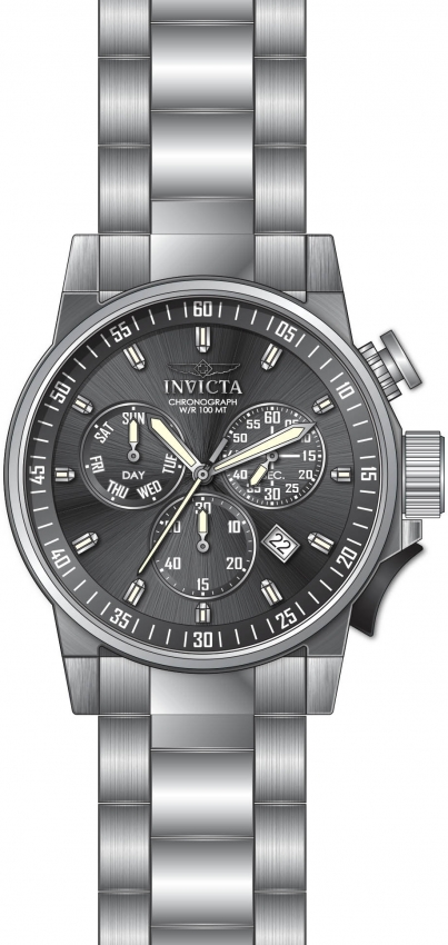 Stainless steel case with a stainless steel bracelet. Fixed stainless steel bezel. Gunmetal dial with luminous silver-tone sword-shaped hands and index hour markers. Minute markers around the outer rim. Dial Type: Analog. Luminescent hands and markers. Date display between the 4 and 5 o'clock positions. Chronograph - two sub-dials displaying: 60 second and 30 minute. Day of the week sub-dial. Ronda caliber Z60 quartz movement. Scratch resistant mineral crystal. Pull / push crown. Solid case back. Round case shape. Case size: 46 mm. Case thickness: 13.1 mm. Band width: 24 mm. Band length: 8.25 inches. Fold over with safety release clasp. Water resistant at 100 meters / 330 feet. Functions: chronograph, date, day, hour, minute, small second. I-force Series. Military watch style. Watch label: Swiss Movt. Invicta I-Force Chronograph Quartz Gunmetal Dial Mens Watch 31632.