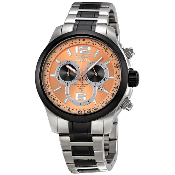 Stainless steel case with a two-tone (silver-tone and black PVD) stainless steel bracelet. Fixed black PVD bezel. Rose gold dial with luminous hands and index hour markers. Arabic numerals mark the 6 and 12 o'clock positions. Minute markers. Tachymeter scale appears around the outer rim. Dial Type: Analog. Luminescent hands and markers. Date display appears at the 4 o'clock position. Chronograph - three sub-dials displaying: 1/10th seconds, 30 minutes and 60 seconds. Quartz movement. Scratch resistant flame fusion crystal. Push / pull crown. Solid case back. Case diameter: 45 mm. Case thickness: 13 mm. Band width: 22 mm. Band length: 9 inches. Fold over safety clasp. Water resistant at 100 meters/ 330 feet. Functions: hours, minutes, seconds, date, chronograph, tachymeter. Sport watch style. Invicta II Rose Gold Two-tone Chronograph Mens Watch 0079.