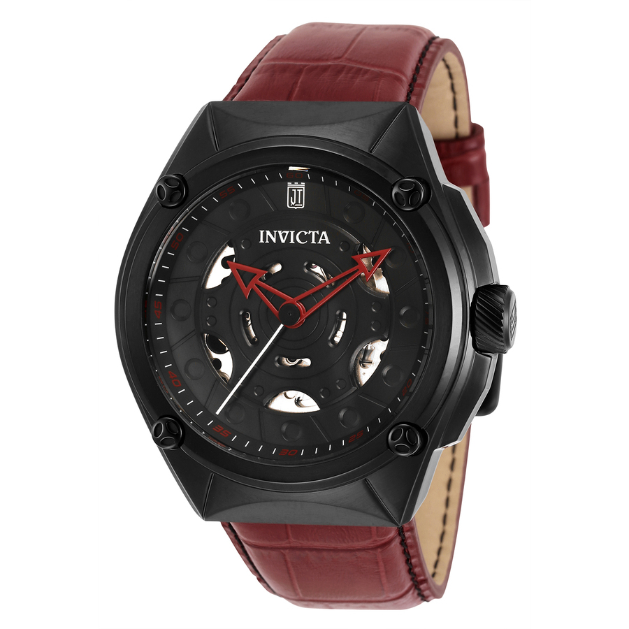 Black stainless steel case with a red leather strap. Fixed black stainless steel bezel. Black dial with red hands and index hour markers. Minute markers around the outer rim. Dial Type: Analog. TMI Caliber NH70 Automatic movement, containing 24 Jewels, bitting at 21600 vph, and has a power reserve of approximately 41 hours. Scratch resistant Flame Fusion crystal. Pull / push crown. Solid case back. Round case shape, case size: 46 mm, case thickness: 12 mm. Band width: 26 mm, band length: 7.75 inches. Buckle clasp. Water resistant at 50 meters / 165 feet. Functions: hour, minute, second. Jason Taylor Series. Casual watch style. Watch label: Japan Movt. Invicta Jason Taylor Automatic Black Dial Mens Watch 33214.