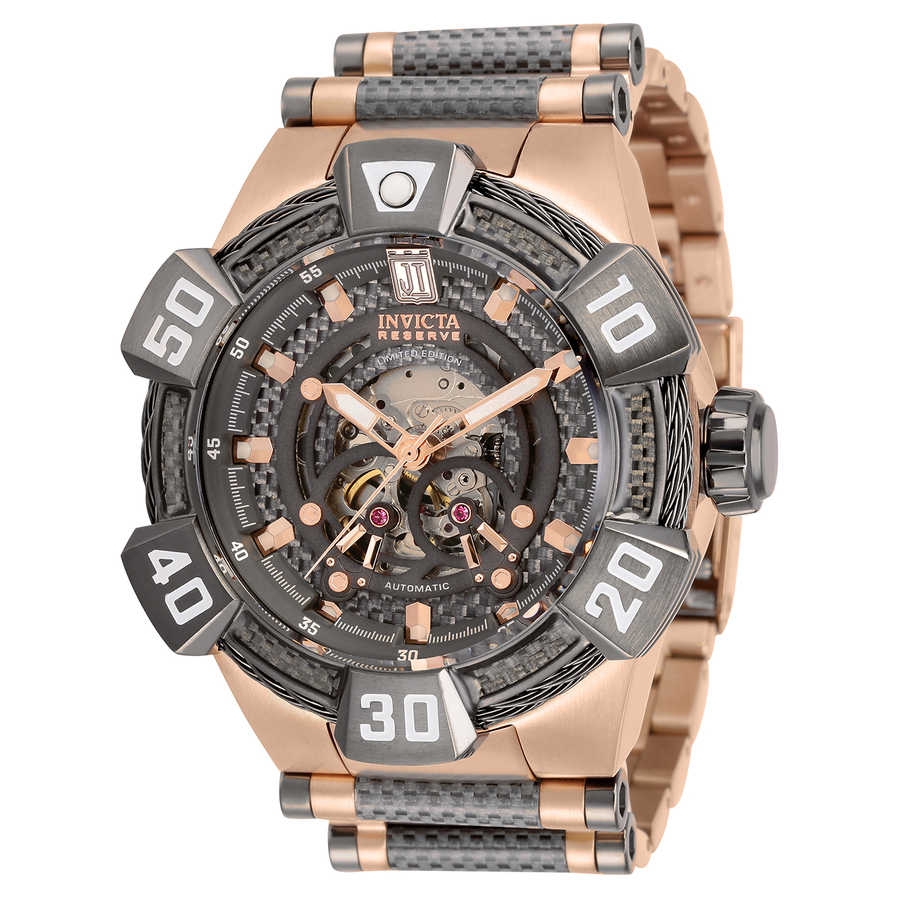 Rose gold-tone stainless steel case with a rose gold stainless steel bracelet with carbon fiber barrel inserts. Fixed gunmetal-plated bezel with carbon fiber inlay with a cable wire trim. Gunmetal carbon fiber (skeleton center) dial with luminous rose gold-tone hands and index hour markers. Arabic numeral minute markers (at 5 minute intervals). Minute markers around the outer rim. Dial Type: Analog. Luminescent hands and markers. Caliber NN2861 automatic movement. Scratch resistant Flame Fusion crystal. Pull / push crown. Transparent case back. Round case shape. Case size: 52 mm. Case thickness: 19.9 mm. Band width: 32 mm. Band length: 7.25 inches. Fold over clasp. Water resistant at 100 meters / 330 feet. Functions: hour, minute, second. Jason Taylor Series. Casual watch style. Invicta Jason Taylor Automatic Gunmetal Dial Mens Watch 32839.