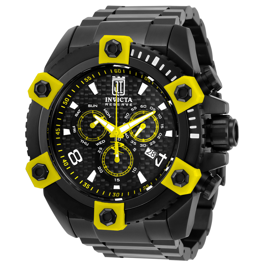 The Jason Taylor for Invicta collection reveals a captivating range of options for the discerning customer. This Limited Edition collection offers reimagined concepts in timekeeping created by Jason Taylor and the Invicta design team. New designs as well as existing masterpieces have been carefully selected and modified by Jason to capture his unique style and aesthetic while maintaining the highest horological standards. The Jason Taylor for Invicta collection time is no longer a spectator sport but rather a sophisticated adventure. Black stainless steel case and bracelet. Uni-directional rotating black stainless steel bezel. Black dial with gold-tone hands and index hour markers. Minute markers around the outer rim. Dial Type: Analog. Luminescent hands and markers. Date display at the 4 o'clock position. Three sub-dials displaying: day, 60 second and 30 minute. Ronda Caliber Z60 quartz movement. Scratch resistant Flame Fusion crystal. Pull / push crown. Solid case back. Round case shape, case size: 56 mm, case thickness: 19 mm. Band width: 31 mm, band length: 8.75 inches. Buckle clasp. Water resistant at 200 meters / 660 feet. Functions: chronograph, date, day, hour, minute, small second. Jason Taylor Series. Sport watch style. Watch label: Swiss Movt. Invicta Jason Taylor Chronograph Quartz Black Dial Mens Watch 33994.