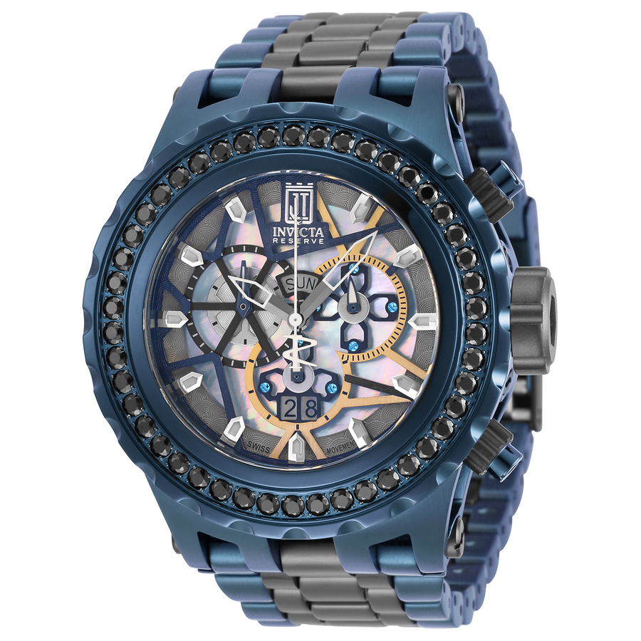 The Jason Taylor for Invicta collection reveals a captivating range of options for the discerning customer. This Limited Edition collection offers reimagined concepts in timekeeping created by Jason Taylor and the Invicta design team. New designs as well as existing masterpieces have been carefully selected and modified by Jason to capture his unique style and aesthetic while maintaining the highest horological standards. The Jason Taylor for Invicta collection time is no longer a spectator sport but rather a sophisticated adventure. Dark blue-plated stainless steel case with a two-tone (dark blue-plated and black-plated) stainless steel bracelet. Fixed dark blue-plated bezel set with black crystals. Grey (mother of pearl) dial with silver-tone skeleton hands and index hour markers. Dial Type: Analog. Luminescent hands and markers. Date display at the 6 o'clock position. day of the week display appears center dial. Chronograph - three sub-dials displaying: 60 second, dual 12 hour / 30 minute and 1/10th of a second. Ronda caliber 5050.C quartz movement. Scratch resistant Flame Fusion crystal. Screw down crown. Solid case back. Round case shape. Case size: 52 mm. Case thickness: 20.25 mm. Band width: 31 mm. Band length: 8.25 inches. Fold over clasp. Water resistant at 500 meters / 1650 feet. Functions: chronograph, big date, day, hour, minute, small second. Jason Taylor Series. Dive watch style. Watch label: Swiss Movt. Invicta Jason Taylor Mother of Pearl Dial Mens Watch 34405.