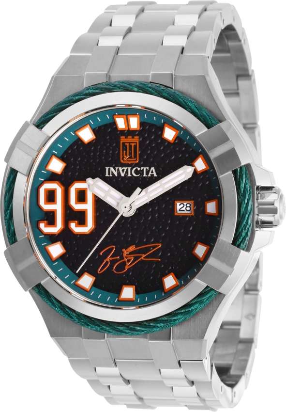 Stainless steel case with a stainless steel bracelet. Fixed stainless steel bezel with a green cable wire trim. Black dial with luminous silver-tone hands and index hour markers. Minute markers around the outer rim. Dial Type: Analog. Luminescent hands and markers. Date display at the 3 o'clock position. SII caliber NH35A automatic movement, containing 24 Jewels, bitting at 21600 vph, and has a power reserve of approximately 41 hours. Scratch resistant flame fusion crystal. Screw down crown. Solid case back. Round case shape. Case size: 48 mm. Case thickness: 18 mm. Band width: 28 mm. Band length: 8.5 inches. Butterfly clasp. Water resistant at 300 meters / 1000 feet. Functions: date, hour, minute, second. Jason Taylor Series. Dive watch style. Watch label: Japan Movt. Invicta Jason Taylor Automatic Black Dial Mens Watch 28525.