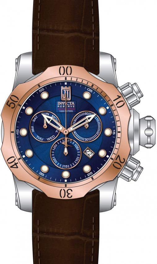 Two-tone (silver-tone and rose gold-tone) stainless steel case with a brown leather strap. Uni-directional rotating rose gold-tone stainless steel bezel. Blue dial with rose gold-tone hands and index hour markers. Minute markers around the outer rim. Dial Type: Analog. Luminescent hands and markers. Date display between 4 and 5 o'clock position. Chronograph - three sub-dials displaying: week, 60 second, 30 minute. Ronda Caliber Z60 quartz movement. Scratch resistant flame fusion crystal. Screw down crown. Solid case back. Round case shape, case size: 53.7 mm, case thickness: 21 mm. Band width: 26 mm, band length: 8.25 inches. Buckle clasp. Water resistant at 1000 meters / 3300 feet. Functions: chronograph, date, day, hour, minute, small second. Dive watch style. Watch label: Swiss Movt. Invicta Jason Taylor Chronograph Quartz Blue Dial Mens Watch 31650.