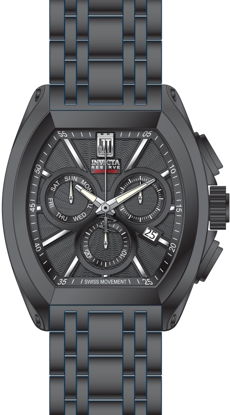 Black stainless steel case and bracelet. Fixed black stainless steel bezel. Black dial with silver-tone hands and index hour markers. Minute markers around the outer rim. Dial Type: Analog. Luminescent hands and markers. Date display at the 4 o'clock position. Three sub-dials displaying: day, 60 second and 30 minute. Ronda Caliber Z60 quartz movement. Scratch resistant Flame Fusion crystal. Pull / push crown. Solid case back. Tonneau case shape, case size: 48 mm, case thickness: 14.85 mm. Band width: 26 mm, band length: 8.25 inches. Fold over clasp. Water resistant at 100 meters / 330 feet. Functions: chronograph, date, day, hour, minute, small second. Jt Series. Sport watch style. Watch label: Swiss Movt. Invicta JT Chronograph Quartz Black Dial Mens Watch 33223.