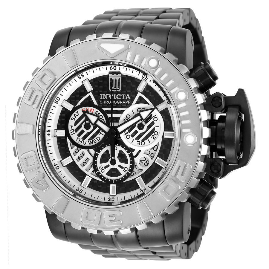 Black and silver-tone stainless steel case with a black stainless steel bracelet. Fixed silver-tone stainless steel bezel. Black dial with black arrow-shaped hands and index hour markers. Minute markers around the outer rim. Dial Type: Analog. Luminescent hands and markers. Date display between 4 and 5 o'clock position. Three sub-dials displaying: day, 60 second and 30 minute. Ronda Caliber Z60 quartz movement. Scratch resistant Flame Fusion crystal. Pull / push crown. Transparent see through case back. Round case shape, case size: 58 mm, case thickness: 23 mm. Band width: 30 mm, band length: 8.25 inches. Fold over clasp with a safety release. Water resistant at 200 meters / 660 feet. Functions: chronograph, date, day, hour, minute, small second. Jt Series. Sport watch style. Watch label: Swiss Movt. Invicta JT Chronograph Quartz Black Dial Mens Watch 33995.