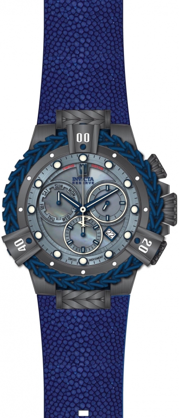 Titanium and dark blue stainless steel case with a blue and titanium and dark blue genuine stingray and stainless steel bracelet. Titanium and dark blue stainless steel bezel. Light blue dial with index hour markers. Minute markers around the outer rim. Dial Type: Analog. Luminescent hands and markers. Date display between 4 and 5 o'clock position. Three sub-dials displaying: day, 60 second and 30 minute. Ronda Caliber Z60 quartz movement. Scratch resistant Flame Fusion crystal. Screw down crown. Solid case back. Round case shape, case size: 53 mm, case thickness: 19.25 mm. Band width: 31 mm, band length: 8.25 inches. Buckle clasp. Water resistant at 200 meters / 660 feet. Functions: chronograph, date, day, hour, minute, small second. Jt Series. Sport watch style. Watch label: Swiss Movt. Invicta JT Chronograph Quartz Mens Watch 34212.