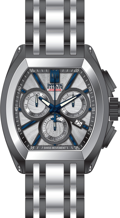 Black and silver-tone stainless steel case with a two-tone (silver-tone and black) stainless steel bracelet. Fixed silver-tone stainless steel bezel. Silver-tone dial with blue hands and index hour markers. Minute markers around the outer rim. Dial Type: Analog. Luminescent hands. Date display at the 4 o'clock position. Three sub-dials displaying: day, 60 second and 30 minute. Ronda Caliber Z60 quartz movement. Scratch resistant Flame Fusion crystal. Pull / push crown. Solid case back. Tonneau case shape, case size: 48 mm, case thickness: 14.85 mm. Band width: 26 mm, band length: 8.25 inches. Fold over clasp. Water resistant at 100 meters / 330 feet. Functions: chronograph, date, day, hour, minute, small second. Jt Series. Sport watch style. Watch label: Swiss Movt. Invicta JT Chronograph Quartz Silver Dial Mens Watch 33226.