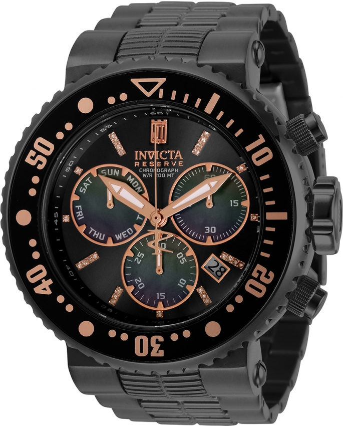 Rose gold and black stainless steel and aluminum case with a black stainless steel bracelet. Uni-directional rotating black and rose gold stainless steel and aluminum bezel. Black and rose gold dial with rose gold-tone sword-shaped hands and index hour markers. Minute markers around the outer rim. Dial Type: Analog. Luminescent hands and markers. Date display between 4 and 5 o'clock position. Chronograph - three sub-dials displaying: week, 60 second, 30 minute. Ronda Caliber Z60 quartz movement. Scratch resistant flame fusion crystal. Screw down crown. Solid case back. Round case shape, case size: 52 mm, case thickness: 20 mm. Band width: 29.8 mm, band length: 8.25 inches. Fold over clasp. Water resistant at 200 meters / 660 feet. Functions: chronograph, date, day, hour, minute, small second. Sport watch style. Watch label: Swiss Movt. Invicta JT Chronograph Quartz Mens Watch 30213.