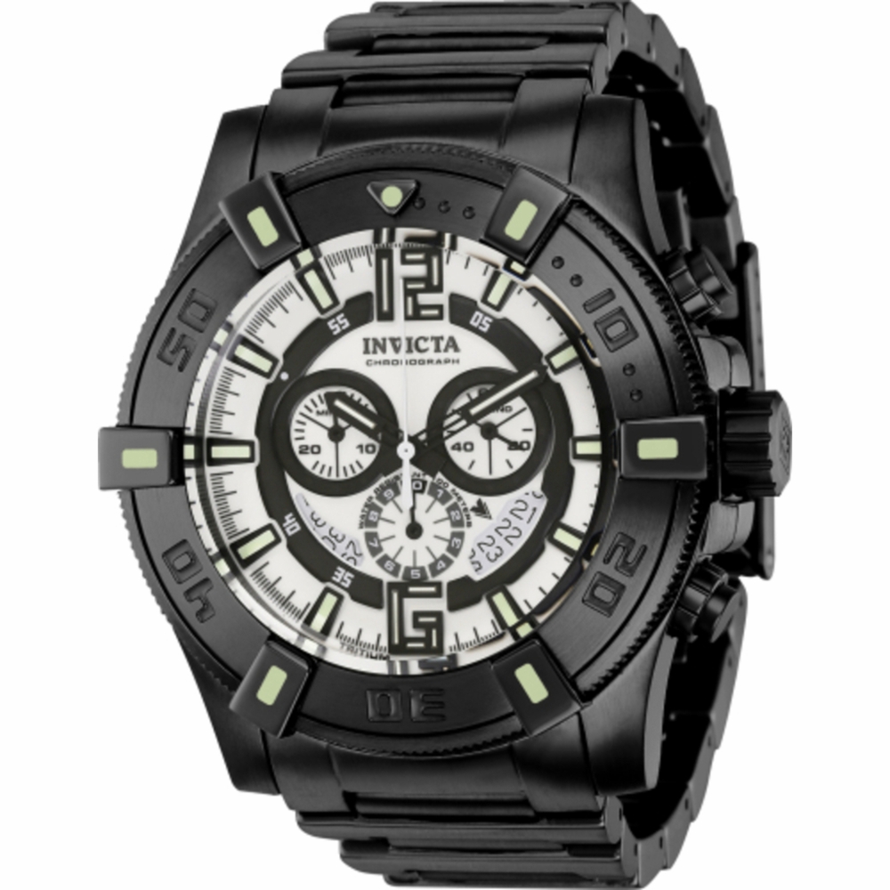 Black stainless steel case and bracelet. Uni-directional rotating black stainless steel bezel. White dial with black hands and index-Arabic numeral hour markers. Minute markers around the outer rim. Dial Type: Analog. Luminescent hands and markers. Date display between 4 and 5 o'clock position. Chronograph - three sub-dials displaying: 60 second, 30 minute and 1/10th of a second. Ronda Caliber 5040.D quartz movement. Scratch resistant Flame Fusion crystal. Pull / push crown. Solid case back. Round case shape, case size: 52 mm, case thickness: 17 mm. Band width: 28 mm, band length: 8.75 inches. Fold over clasp. Water resistant at 100 meters / 330 feet. Functions: chronograph, date, hour, minute, small second. Luminary Series. Sport watch style. Watch label: Swiss Movt. Invicta Luminary Chronograph Quartz White Dial Mens Watch 38197.