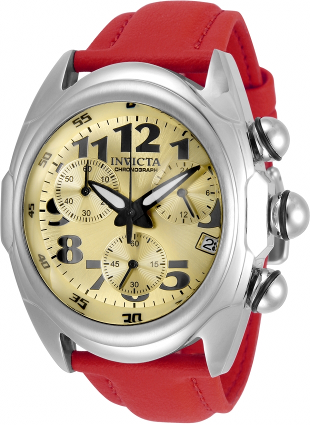 Silver-tone stainless steel case with a red polyurethane strap. Fixed silver-tone stainless steel bezel. Champagne dial with black hands and Arabic numeral hour markers. Minute markers around the outer rim. Dial Type: Analog. Luminescent hands. Date display at the 4 o'clock position. Three sub-dials displaying: day, 24 hour and 60 minute. SII Caliber VK68A quartz movement. Scratch resistant Flame Fusion crystal. Pull / push crown. Solid case back. Oval case shape, case size: 46 mm, case thickness: 24 mm. Band width: 26 mm, band length: 7.75 inches. Buckle clasp. Water resistant at 100 meters / 330 feet. Functions: chronograph, date, GMT, second time zone, hour, minute, second. Lupah Series. Sport watch style. Watch label: Japan Movt. Invicta Lupah Chronograph Quartz Champagne Dial Mens Watch 31404.