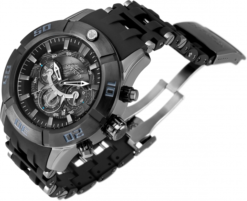 Gunmetal-plated stainless steel case with a black polyurethane strap with a gunmetal-plated barrel inserts. Uni-directional rotating black-plated stainless steel bezel. Black dial with gunmetal skeleton hands and Arabic numeral hour markers. Minute markers around the outer rim. Dial Type: Analog. Luminescent hands and markers. Date display between the 4 and 5 o'clock positions. Chronograph - three sub-dials displaying: 60 second, 60 minute and 24 hour. Hattori Caliber VD53 quartz movement. Scratch resistant Flame Fusion crystal. Pull / push crown. Solid case back. Round case shape. Case size: 50 mm. Case thickness: 17 mm. Band width: 26 mm. Band length: 7.25 inches. Fold over clasp. Water resistant at 100 meters / 330 feet. Functions: chronograph, date, GMT, second time zone, hour, minute, second. Marvel Series. Sport watch style. Watch label: Japan Movt. Invicta Marvel Black Panther Chronograph Quartz Black Dial Mens Watch 26749.