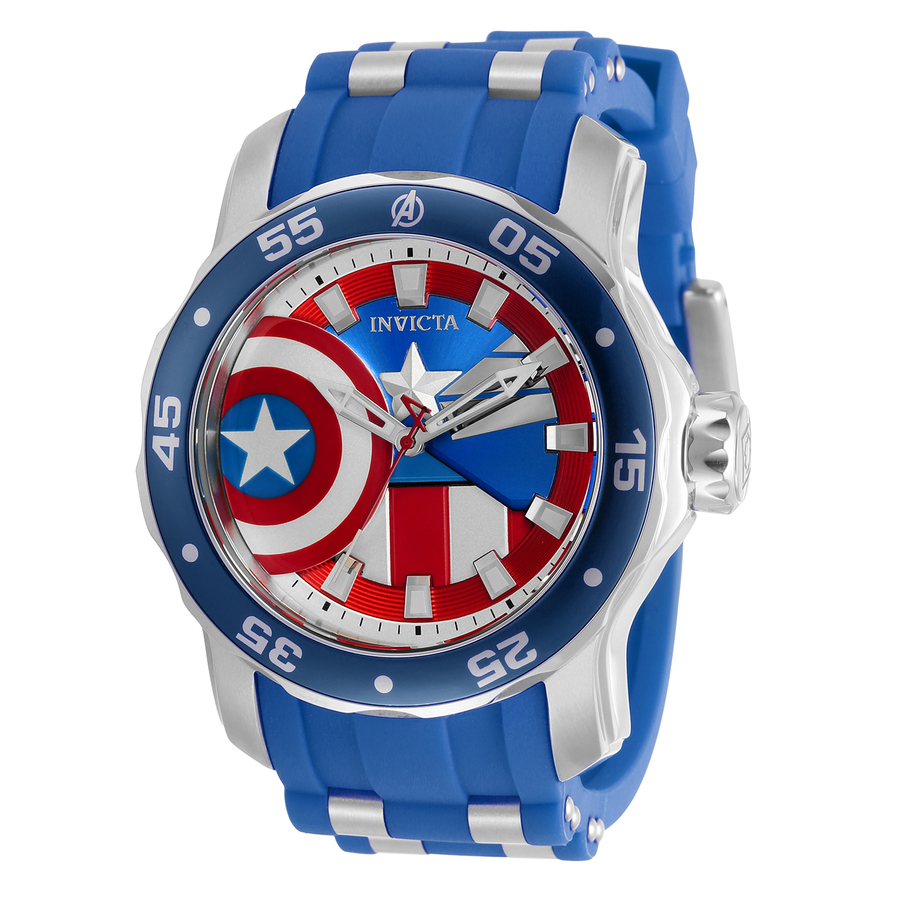Soldiering through the MARVEL Universe since 1942 Captain America embodies all the qualities of the persevering loyal and conscientious American soldier. It is in thetrue American spirit defined by integrity of character that Cap always proceeds moving through his missions with adetermination and strength that not only thrills but is an ongoing inspiration to fans. Steve Rogers and his indestructible shield face combat with the honorable sense of a hero that makes him truly super. Silver-tone stainless steel case with a silver-tone and blue silicone and stainless steel strap. Uni-directional rotating silver and blue and white stainless steel bezel. White and blue and red dial with silver-tone hands and index hour markers. Minute markers around the outer rim. Dial Type: Analog. Luminescent hands and markers. Hattori Caliber PC21AF quartz movement. Scratch resistant Flame Fusion crystal. Pull / push crown. Solid case back. Round case shape, case size: 48 mm. Band width: 26 mm, band length: 8.25 inches. Buckle clasp. Water resistant at 100 meters / 330 feet. Functions: hour, minute, second. Marvel Series. Casual watch style. Watch label: Japan Movt. Invicta Marvel Captain America Quartz Mens Watch 34743.