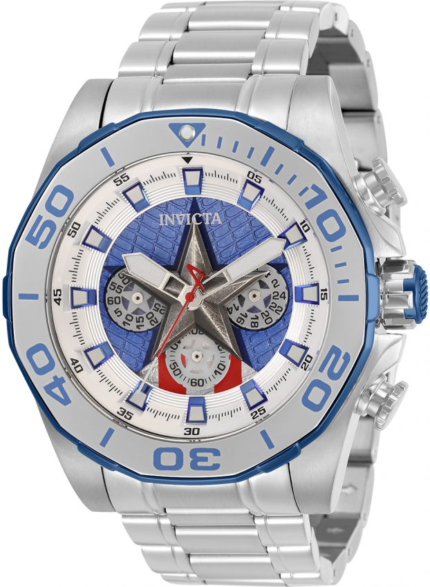 Silver-tone stainless steel case and bracelet. Uni-directional rotating blue and silver-tone stainless steel bezel. Blue and white dial with silver-tone hands and index hour markers. Minute markers around the outer rim. Dial Type: Analog. Luminescent hands and markers. Chronograph - three sub-dials displaying: 60 second, 60 minute and 24 hour. Hattori Caliber VD54 quartz movement. Scratch resistant Flame Fusion crystal. Pull / push crown. Solid case back. Round case shape, case size: 48 mm, case thickness: 15.4 mm. Band width: 24 mm, band length: 7 inches. Fold over clasp. Water resistant at 100 meters / 330 feet. Functions: chronograph, GMT, second time zone, hour, minute, second. Marvel Series. Sport watch style. Watch label: Japan Movt. Invicta Marvel Captain America Chronograph Quartz Mens Watch 32917.
