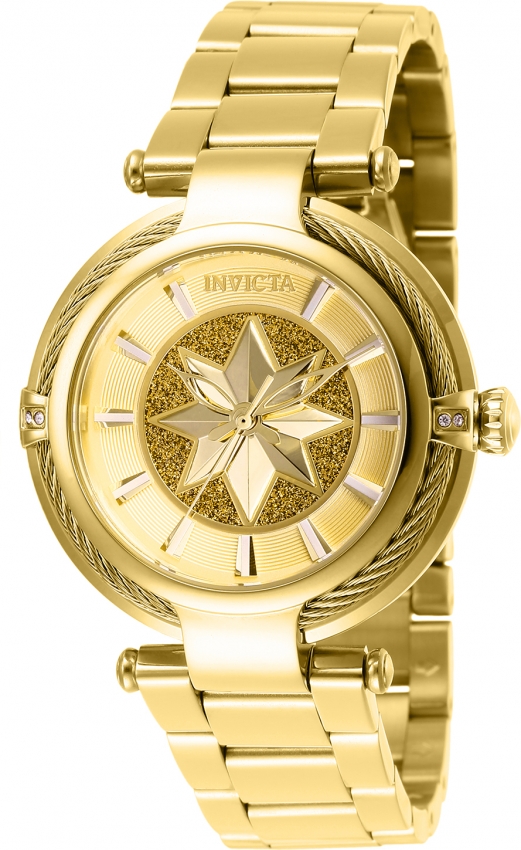28833 Marvel Captain Marvel Invicta watch. Gold-tone stainless steel case and bracelet. Fixed gold-tone stainless steel and cable bezel. Gold-tone dial with gold-tone hands and index hour markers. Dial Type: Analog. Hattori Caliber PC21 quartz movement. Scratch resistant Flame Fusion crystal. Pull / push crown. Solid case back. Round case shape, case size: 40 mm, case thickness: 12.5 mm. Band width: 20 mm, band length: 7 inches. Deployment clasp. Water resistant at 100 meters / 330 feet. Functions: hour, minute, second. Marvel Series. Casual watch style. Watch label: Japan Movt. Invicta Marvel Captain Marvel Quartz Gold Dial Ladies Watch 28833.