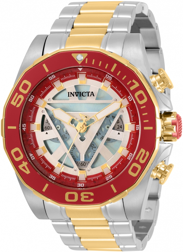 Silver-tone stainless steel case with a two-tone (silver-tone and gold-tone) stainless steel bracelet. Uni-directional rotating red and gold and silver stainless steel bezel. Blue and silver and red dial with gold-tone hands and index hour markers. Minute markers around the outer rim. Dial Type: Analog. Luminescent hands and markers. Chronograph - three sub-dials displaying: 60 second, 60 minute and 24 hour. Hattori Caliber VD54 quartz movement. Scratch resistant Flame Fusion crystal. Pull / push crown. Solid case back. Round case shape, case size: 48 mm, case thickness: 15.4 mm. Band width: 24 mm, band length: 7 inches. Fold over clasp. Water resistant at 100 meters / 330 feet. Functions: chronograph, GMT, second time zone, hour, minute, second. Marvel Series. Sport watch style. Watch label: Japan Movt. Invicta Marvel Ironman Chronograph Quartz Mens Watch 33368.