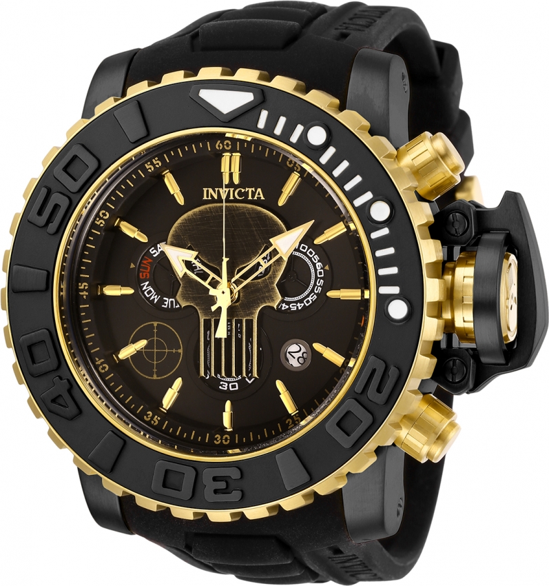 Two-tone (black and gold-tone) stainless steel case with a black silicone strap. Uni-directional rotating black stainless steel bezel. Black dial with gold-tone hands and index hour markers. Minute markers around the outer rim. Dial Type: Analog. Luminescent hands. Date display between 4 and 5 o'clock position. Three sub-dials displaying: day, 60 second and 30 minute. Ronda Caliber Z60 quartz movement. Scratch resistant Flame Fusion crystal. Pull / push crown. Solid case back. Round case shape, case size: 58 mm, case thickness: 24 mm. Band width: 30 mm, band length: 9.25 inches. Buckle clasp. Water resistant at 200 meters / 660 feet. Functions: chronograph, date, day, hour, minute, small second. Marvel Series. Sport watch style. Watch label: Swiss Movt. Invicta Marvel Limited Edition Punisher Chronograph Quartz Black Dial Mens Watch 26787.