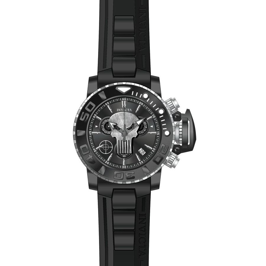 Black-plated stainless steel case with a black silicone strap. Uni-directional rotating stainless steel bezel with an inlaid black ring. Black (Punisher) dial with luminous black hands and index hour markers. Arabic numeral minute markers (at 5 minute intervals). Minute markers around the outer rim. Dial Type: Analog. Luminescent hands and markers. Date display between the 4 and 5 o'clock positions. Chronograph - two sub-dials displaying: 60 second and 30 minute. SII caliber VK68A quartz movement. Scratch resistant Flame Fusion crystal. Pull / push crown. Solid case back. Round case shape. Case size: 46 mm. Band width: 24 mm. Band length: 8.75 inches. Tang clasp. Water resistant at 200 meters / 660 feet. Functions: chronograph, date, GMT, second time zone, hour, minute, second. Marvel Series. Casual watch style. Watch label: Japan Movt. Invicta Marvel Punisher Chronograph Black Dial Ladies Watch 34923.