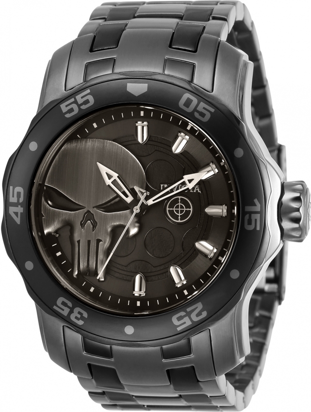 32420 Marvel Punisher Invicta watch. Gunmetal stainless steel case and bracelet. Uni-directional rotating gunmetal and black stainless steel bezel. Gunmetal dial with silver-tone hands and index hour markers. Minute markers around the outer rim. Dial Type: Analog. Luminescent hands and markers. Hattori Caliber PC21AF quartz movement. Scratch resistant Flame Fusion crystal. Pull / push crown. Solid case back. Round case shape, case size: 48 mm, case thickness: 17.6 mm. Band width: 26 mm, band length: 7.75 inches. Fold over clasp. Water resistant at 100 meters / 330 feet. Functions: hour, minute, second. Marvel Series. Casual watch style. Watch label: Japan Movt. Invicta Marvel Punisher Quartz Gunmetal Dial Mens Watch 32420.