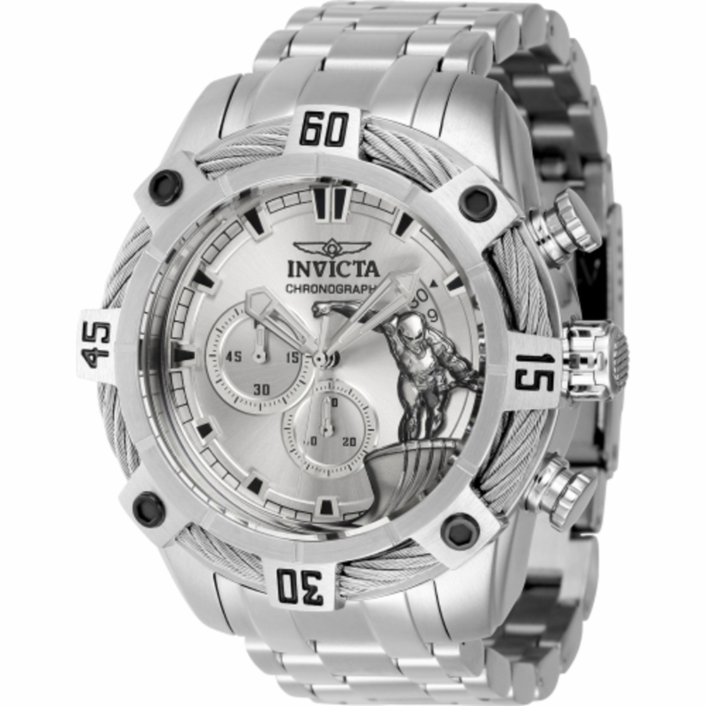 Silver-tone stainless steel case and bracelet. Silver-tone cable and stainless steel bezel. Silver-tone dial with silver-tone hands and index hour markers. Minute markers around the outer rim. Dial Type: Analog. Date display between 1 and 2 o'clock position. Chronograph - two sub-dials displaying: 60 second and 60 minute. TMI Caliber VD5F quartz movement. Scratch resistant Flame Fusion crystal. Pull / push crown. Solid case back. Round case shape, case size: 52 mm. Band width: 26 mm, band length: 7.50 inches. Fold over clasp. Water resistant at 100 meters / 330 feet. Functions: chronograph, date, hour, minute, second. Marvel Series. Casual watch style. Watch label: Japan Movt. Invicta Marvel Silver Surfer Chronograph Quartz Silver Dial Mens Watch 41303.