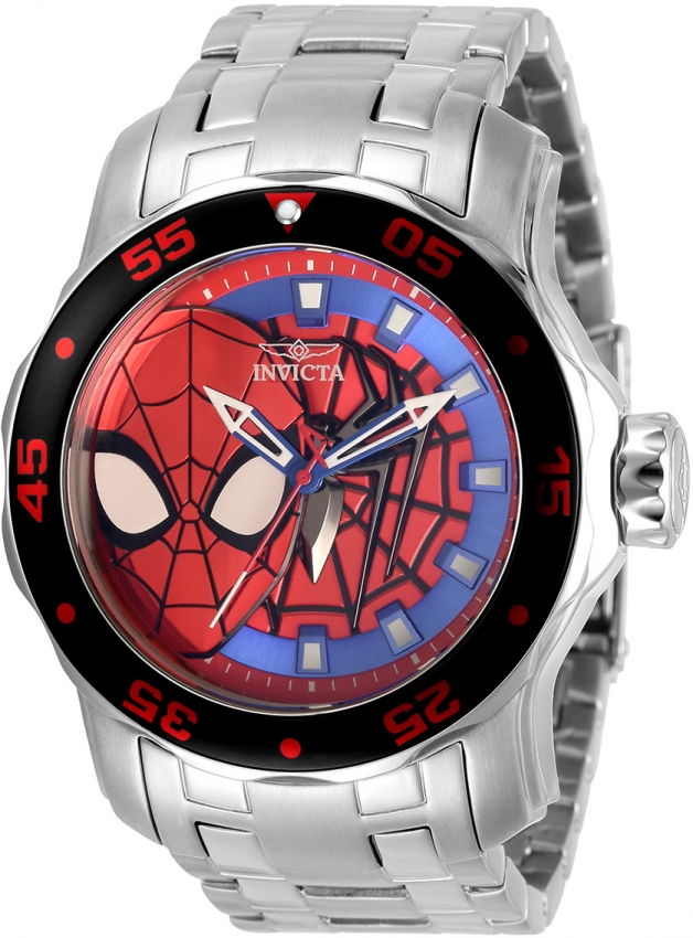 32418 Marvel Spiderman Invicta watch. Silver-tone stainless steel case and bracelet. Uni-directional rotating silver-tone and black and red stainless steel bezel. Red and blue and black dial with blue hands and index hour markers. Minute markers around the outer rim. Dial Type: Analog. Luminescent hands and markers. Hattori Caliber PC21AF quartz movement. Scratch resistant Flame Fusion crystal. Pull / push crown. Solid case back. Round case shape, case size: 48 mm. Band width: 26 mm, band length: 7.25 inches. Fold over clasp. Water resistant at 100 meters / 330 feet. Functions: hour, minute, second. Marvel Series. Casual watch style. Watch label: Japan Movt. Invicta Marvel Spiderman Quartz Mens Watch 32418.