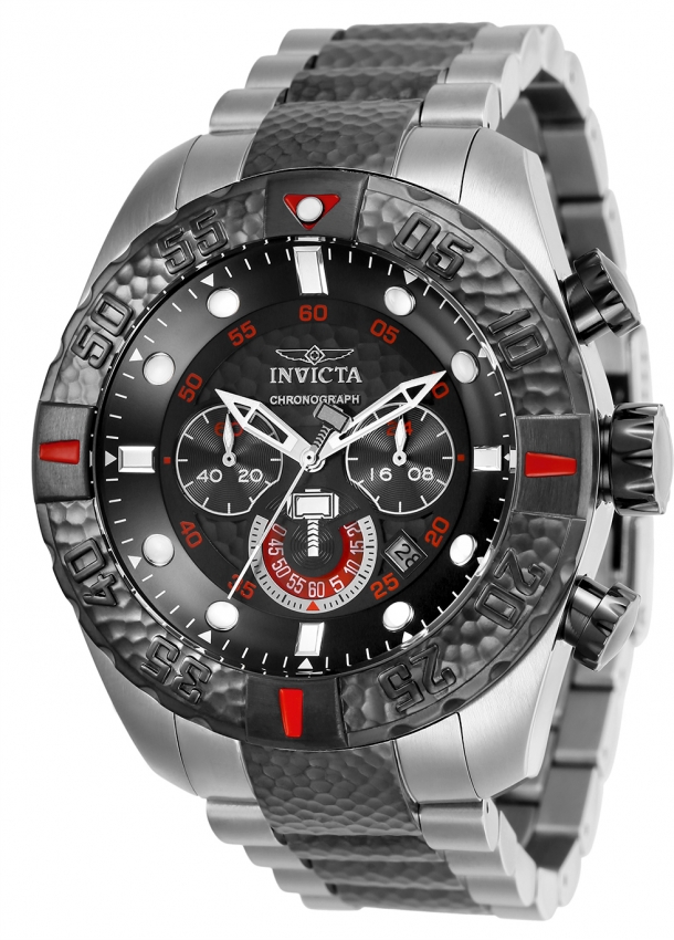 Silver-tone stainless steel case with a two-tone (black and silver-tone) stainless steel bracelet. Uni-directional rotating white , red, gunmetal stainless steel bezel. Black dial with silver-tone hands and dot and index hour markers. Minute markers around the outer rim. Dial Type: Analog. Luminescent hands and markers. Date display between 4 and 5 o'clock position. Chronograph - three sub-dials displaying: 60 second, 60 minute and 24 hour. Hattori Caliber VD53 quartz movement. Scratch resistant flame fusion crystal. Pull / push crown. Solid case back. Round case shape. Case size: 51 mm. Band width: 30 mm, band length: 190 mm. Fold over clasp. Water resistant at 100 meters / 330 feet. Functions: chronograph, date, hour, minute, second. Additional Info: marvel's thor limited edition. Sport watch style. Watch label: Japan Movt. Invicta Marvel Thor Chronograph Black Dial Two-Tone Mens Watch 25984.